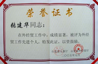 2005年元月張建華同志被評為“外經貿工作先進個人”