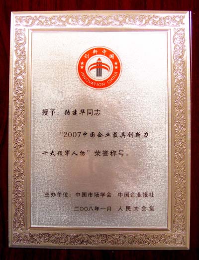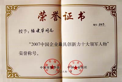 2008年1月中國市場學(xué)會(huì)、中國企業(yè)報(bào)社授予張建華同志“2007中國企業(yè)最具創(chuàng)新力十大領(lǐng)軍人