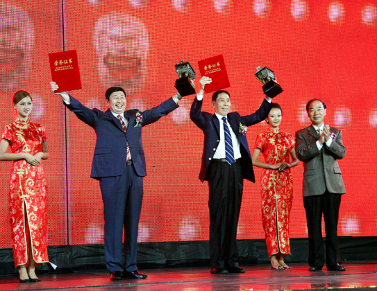圖為張建華、常德傳兩位領(lǐng)導(dǎo)分別代表新華錦和青島港兩家企業(yè)一起上臺,領(lǐng)取“青島經(jīng)濟(jì)成就卓越貢獻(xiàn)獎”獎項和證書,青島電視臺等媒體現(xiàn)場直播了整個頒獎典禮。