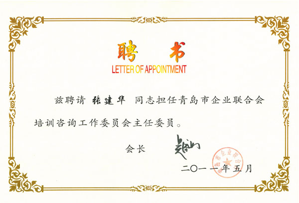 張董事長被聘為青島市企業(yè)聯(lián)合會培訓(xùn)工作委員會主任委員