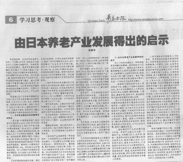 ? 由日本養(yǎng)老產(chǎn)業(yè)發(fā)展得出的啟示(青島日報) - 媒體報道 - :: HIKING GROUP 新華錦首頁(國際貿(mào)易)(金融投資)(老年頤養(yǎng)) ::