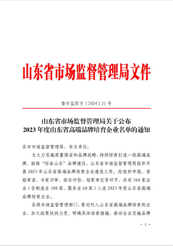 為大力實(shí)施質(zhì)量強(qiáng)省和品牌戰(zhàn)略,持續(xù)培育打造一批高端品牌,助推“好品山東”品牌建設(shè),山東省市場監(jiān)督管理局組織開展2023年山東省高端品牌培育企業(yè)遴選工作。經(jīng)組織申報(bào)、資格審查、專家評審、綜合評價(jià)、結(jié)果審定等環(huán)節(jié),共有360家企業(yè)(含制造業(yè)300家、服務(wù)業(yè)60家)入選2023年度山東省高端品牌培育企業(yè)。
