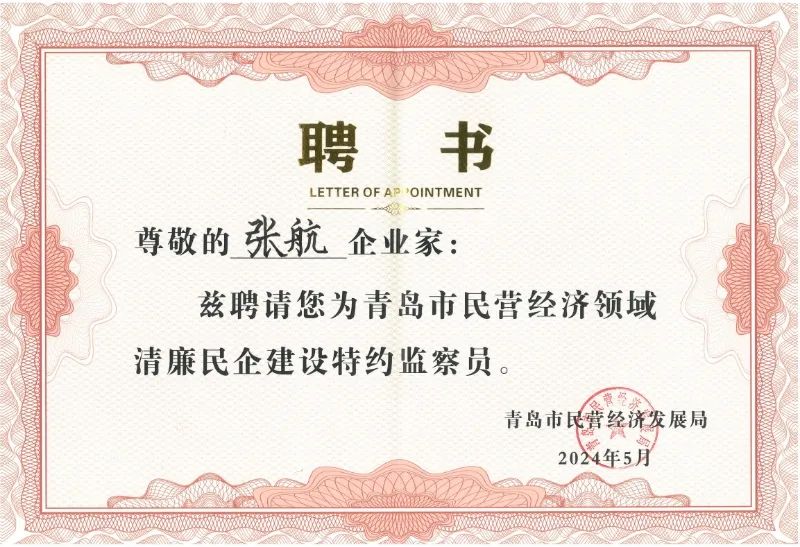 青島市民營(yíng)經(jīng)濟(jì)商業(yè)聯(lián)合會(huì)會(huì)長(zhǎng)、新華錦集團(tuán)執(zhí)行總裁張航參加儀式,代表青島市民營(yíng)經(jīng)濟(jì)商業(yè)聯(lián)合會(huì)發(fā)布《民營(yíng)企業(yè)清廉建設(shè)評(píng)價(jià)規(guī)范》團(tuán)體標(biāo)準(zhǔn),并受聘擔(dān)任青島市民營(yíng)經(jīng)濟(jì)領(lǐng)域清廉民企建設(shè)特約監(jiān)察員。