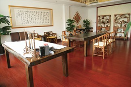 古樸自然的明清桌椅,精美的紫砂工藝,潺潺的流水,加上舒緩悠揚(yáng)的古箏樂(lè)演奏,宛如清雅脫俗的世外桃源,賞畫(huà)、品茗來(lái)自嶗山清泉泡出的香茶,好運(yùn)會(huì)在這份愜意中悄然而至。